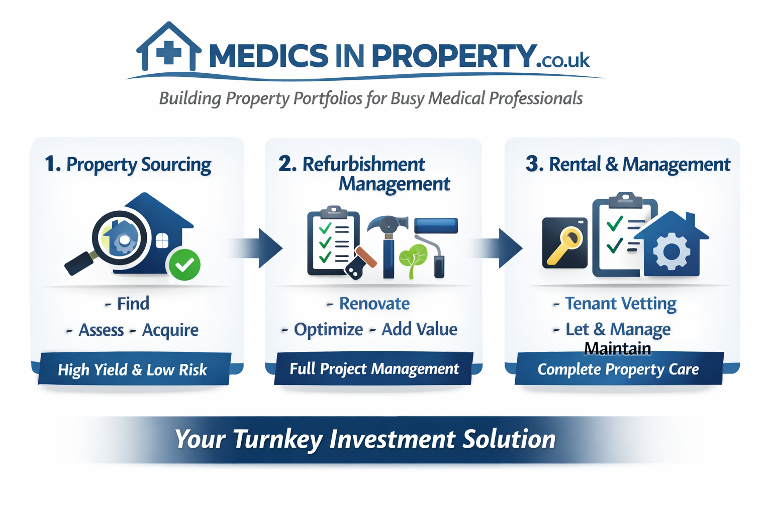 Whether you are starting your first investment or expanding an existing portfolio, Medics In Property provides a complete, hands-off solution for building property portfolios for busy medical professionals across the UK.